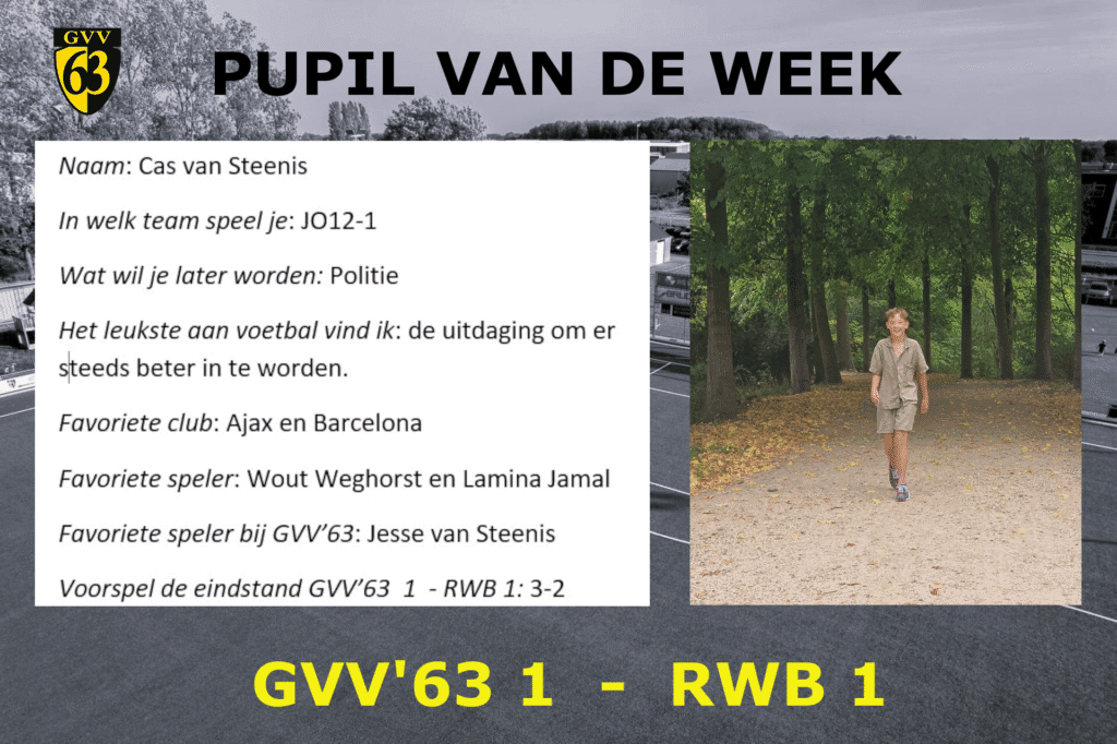 GVV’63 kende vorige week een teleurstellende wedstrijd tegen The Gunners. Door deze nederlaag maakt GVV’63 geen kans meer op de volgende bekerronde. Tegenstander RWB is momenteel koploper in de bekerpoule en zal moeten winnen om deze positie vast te houden.