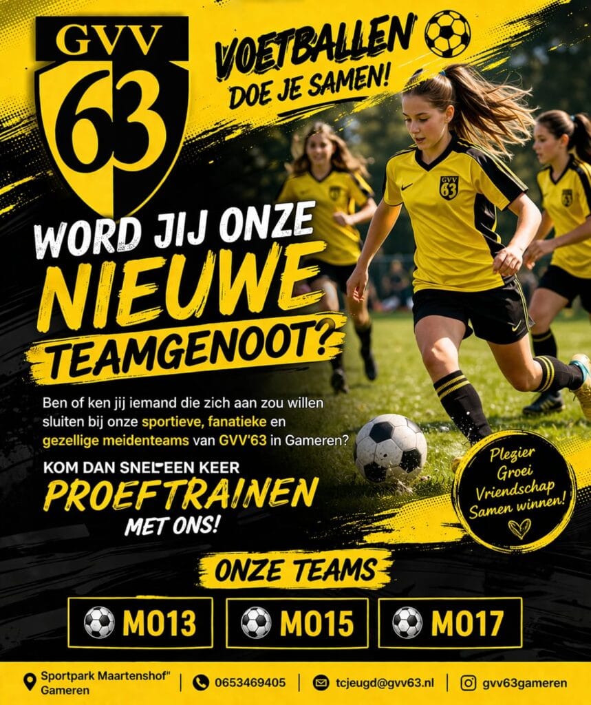 Voor de meidenvoetbal afdeling van GVV’63 zijn we op zoek naar nieuwe speelsters. Sportieve meiden zijn van harte welkom in de teams: Meiden onder 13 jaar (MO13), Meiden onder 15 jaar (MO15) en Meiden onder 17 jaar (MO17).